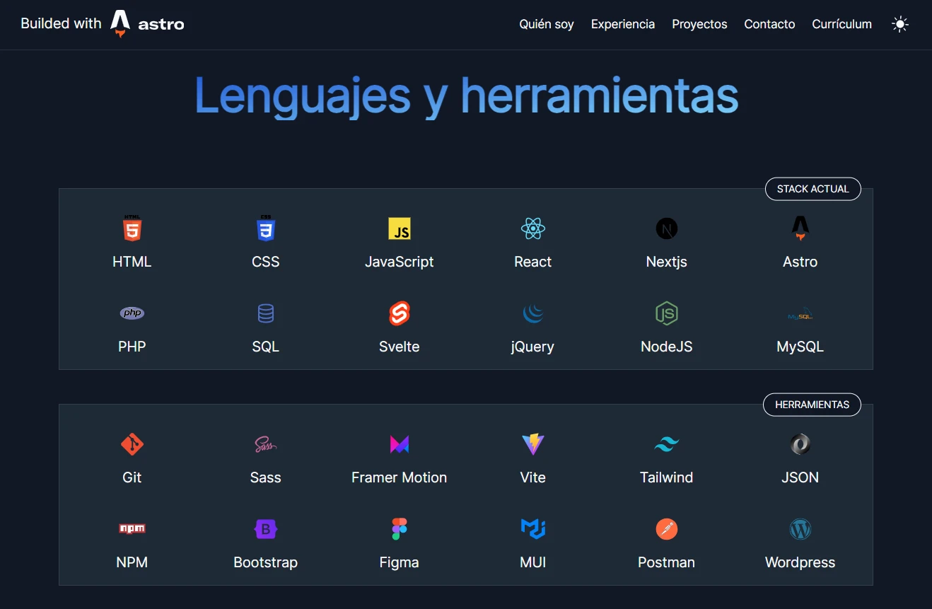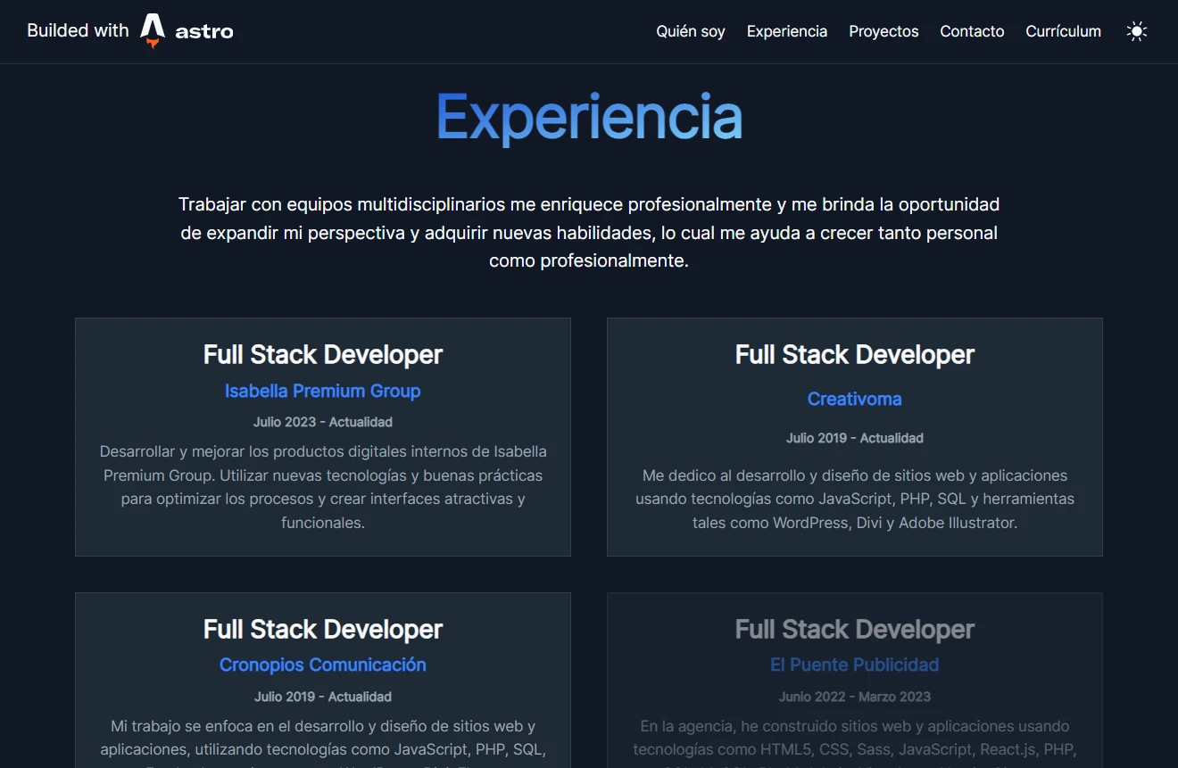 Este es mi portfolio v1 personal, diseñado y desarrollado con Astro.build y Tailwind CSS. Astro.build me permitió crear una experiencia de usuario fluida y optimizada, mientras que Tailwind CSS me proporcionó un conjunto de herramientas para estilizar rápidamente mi sitio web.